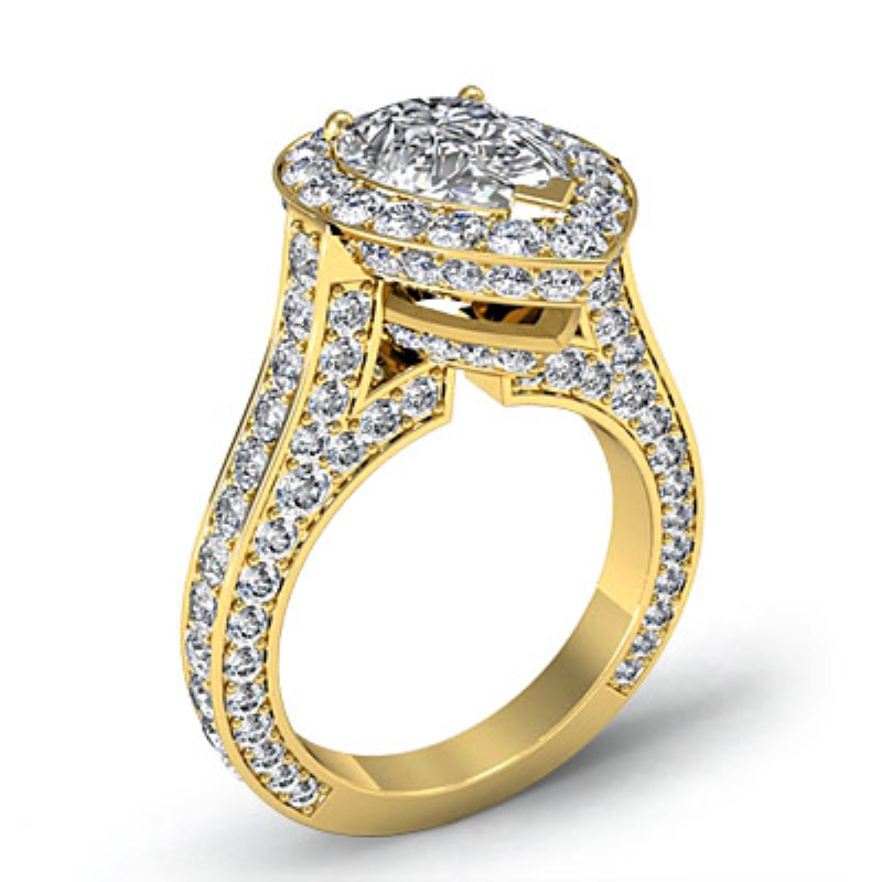 Halo Micro Pave Bridge Accent style Engagement Ring, center is Pear shape Diamond Report by IGI, E Color & VS1 clarity, Made in 18k Yellow Gold (3.32 ct. tw.)