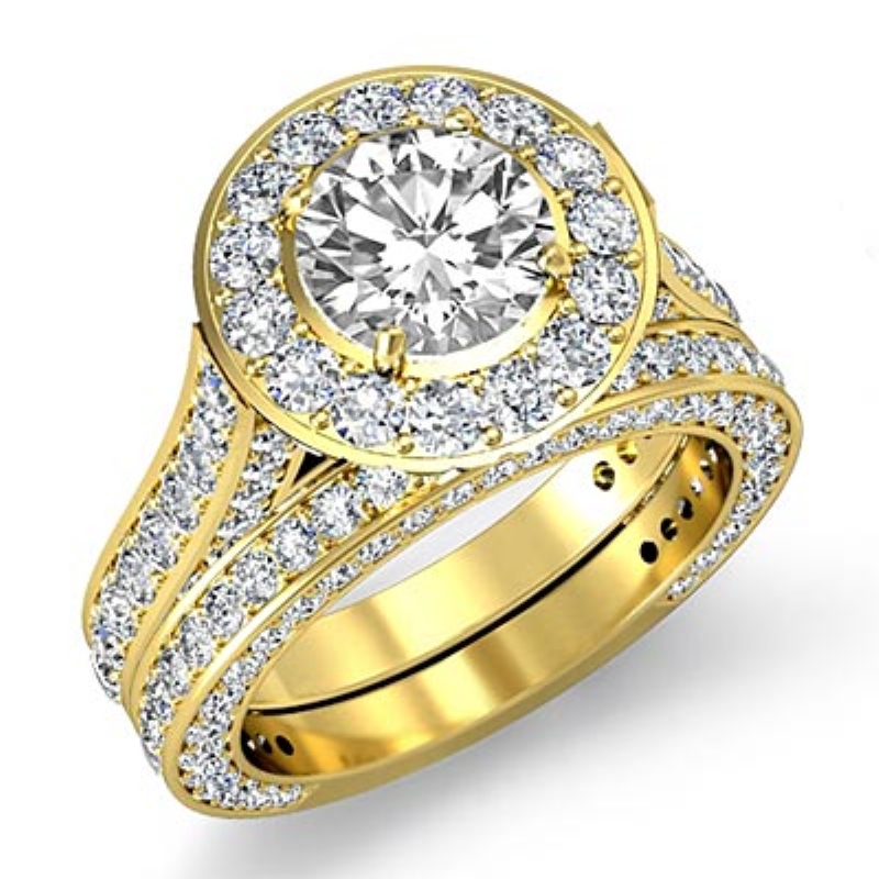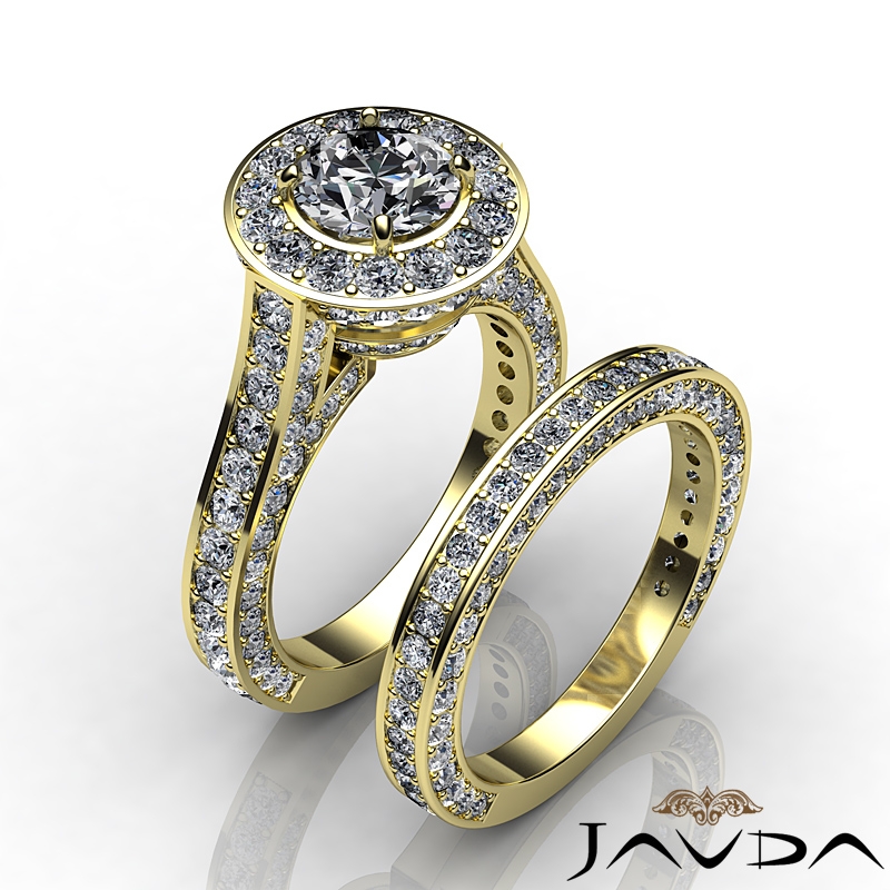Vintage Halo Pave Bridal Set style Engagement Ring, center is Round shape Diamond Report by GIA, I Color & SI1 clarity, Made in 18k Yellow Gold (4.45 ct. tw.)
