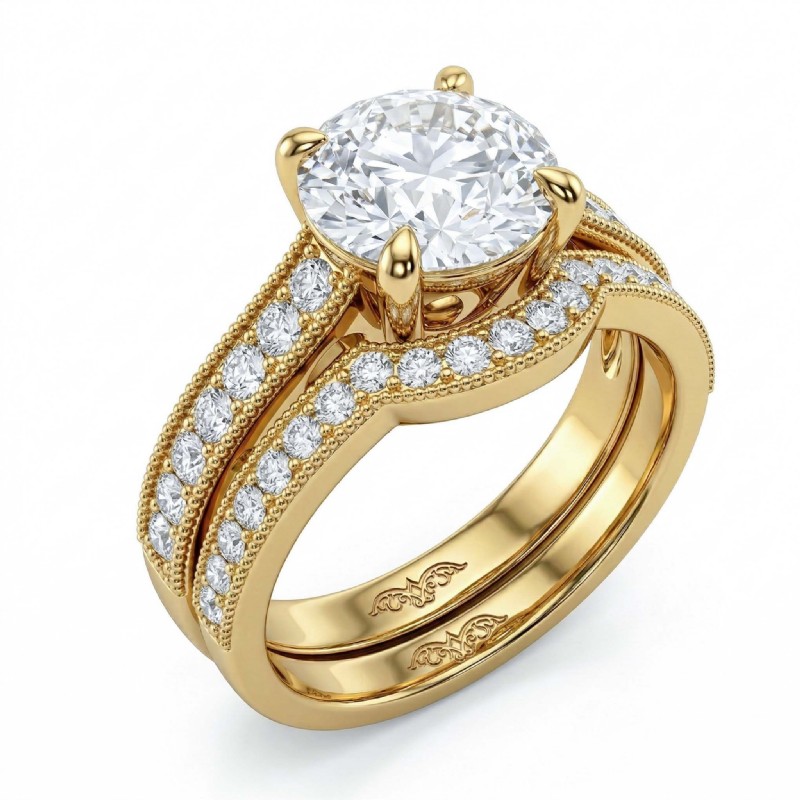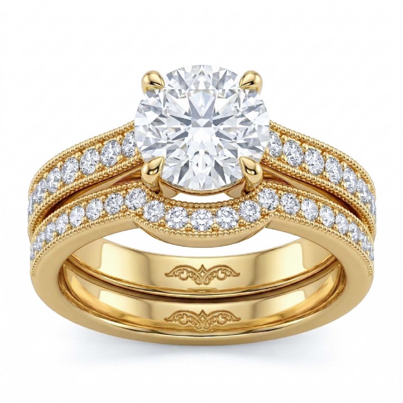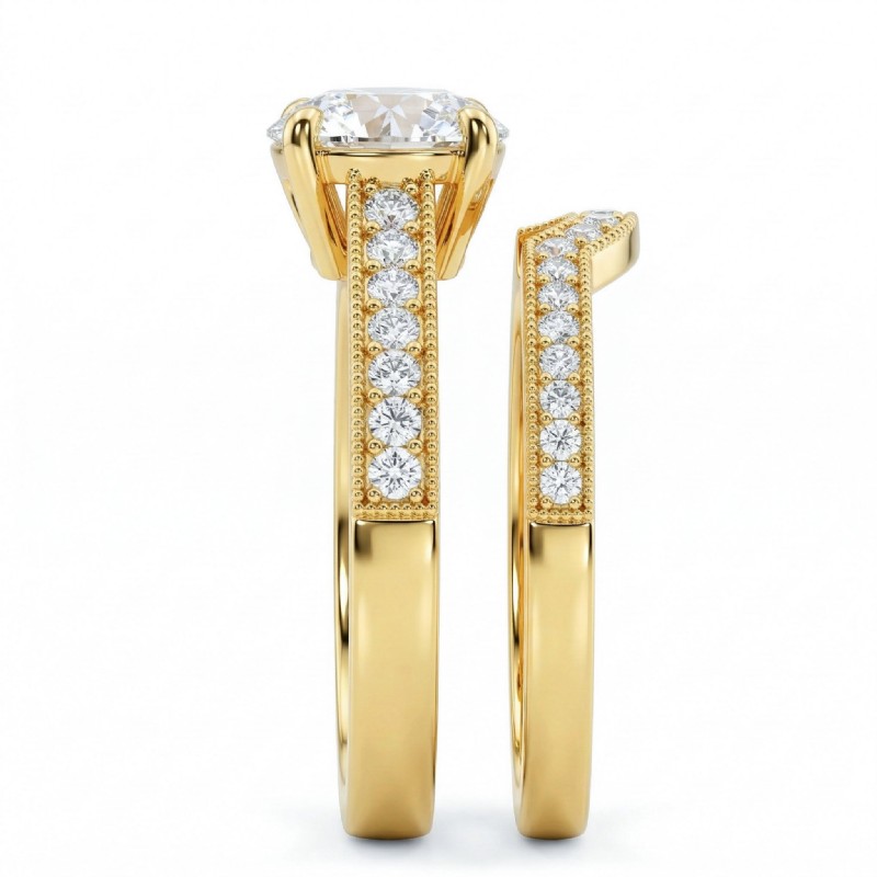 Diamond Engagement Millgrain Setting Ring Round Bridal Set 14k Yellow Gold 0.6Ct.