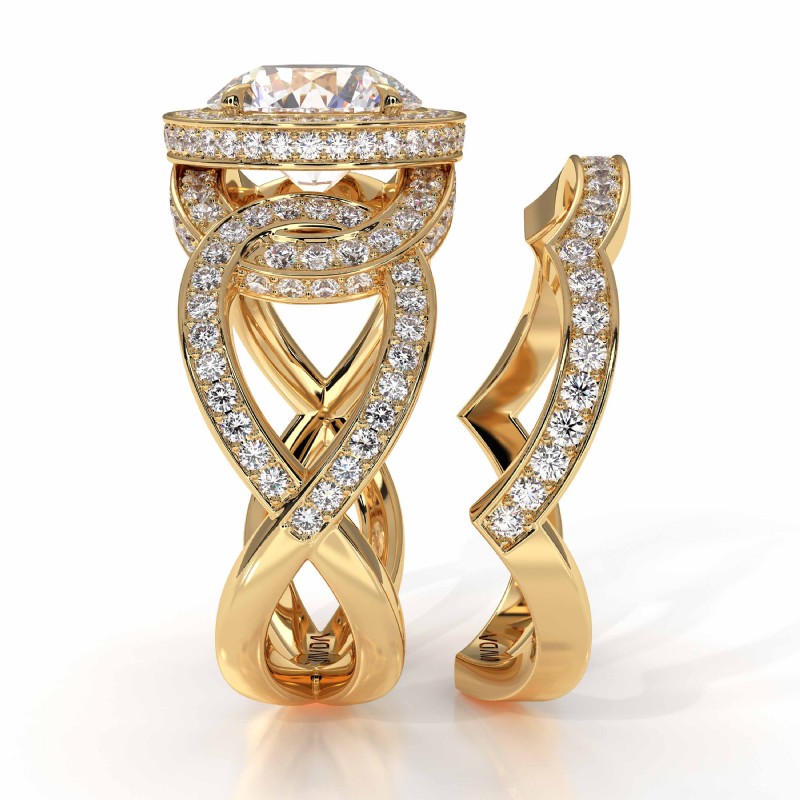 Twisted Halo Bridal Set style Engagement Ring, center is Round shape Diamond Report by IGI, D Color & VS1 clarity, Made in 14k Yellow Gold (2.74 ct. tw.)