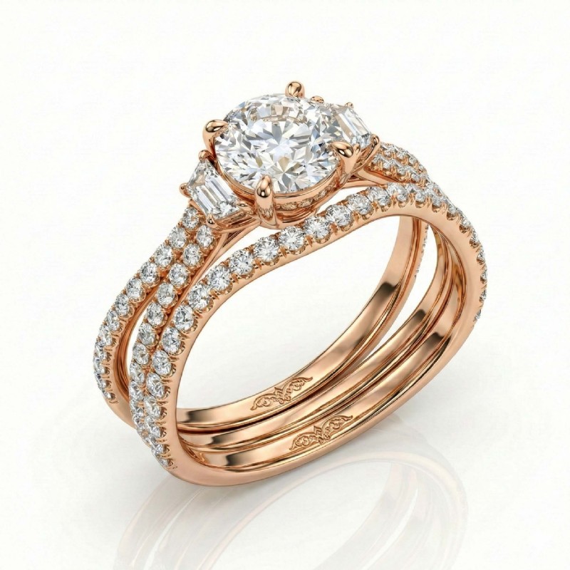 0.95Ct Three Stone Round Semi Mount Bridal Set Diamond Engagement Ring 18k Rose Gold.