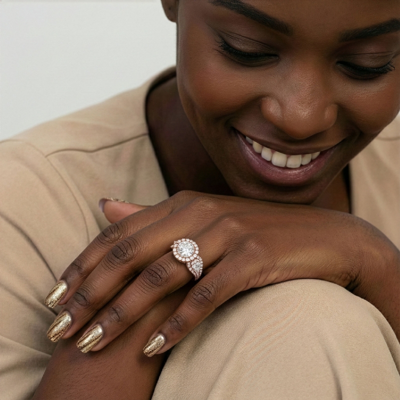 3 Stone Round Diamond Vintage style Engagement Halo Ring Set 18k Rose Gold Semi-Mount 1.85Ct.