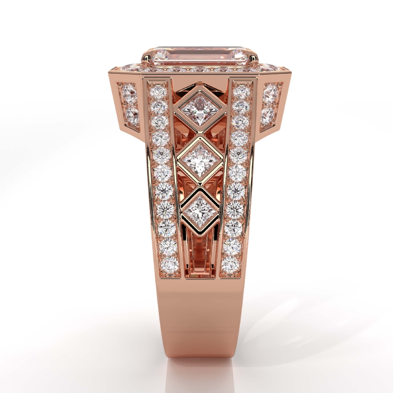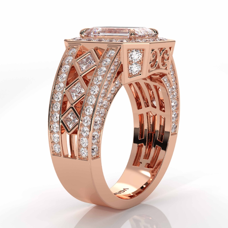Vintage Style Bezel Halo Pave style Engagement Ring, center is Emerald shape Diamond Report by IGI, D Color & VS1 clarity, Made in 18k Rose Gold (3.7 ct. tw.)