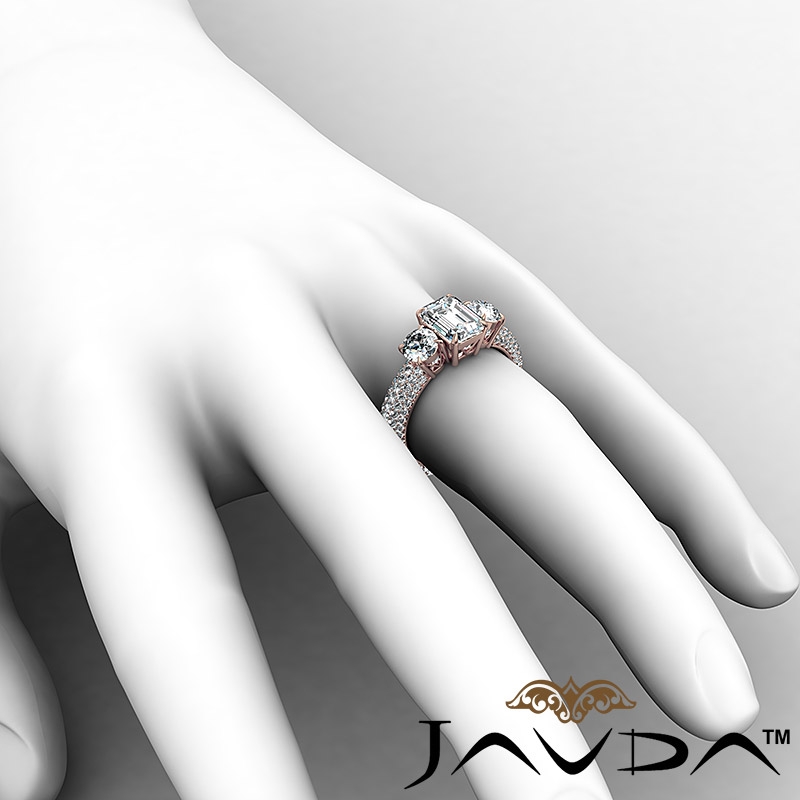 Micro Pave Set Three Stone style Engagement Ring, center is Emerald shape Diamond Report by IGI, D Color & VS1 clarity, Made in 14k Rose Gold (3.64 ct. tw.)