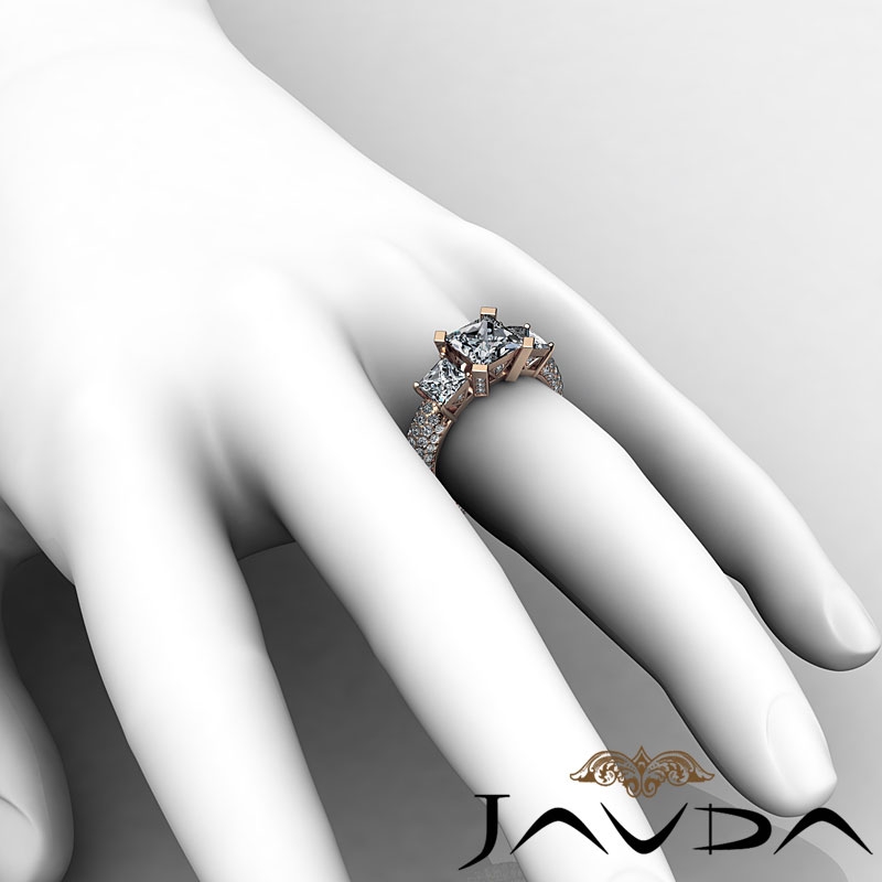 Micro Pave Set Three Stone style Engagement Ring, center is Princess shape Diamond Report by IGI, D Color & VS1 clarity, Made in 14k Rose Gold (3.66 ct. tw.)