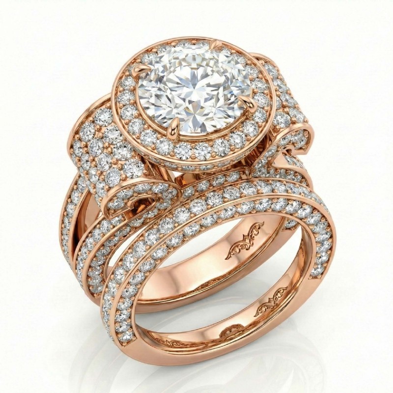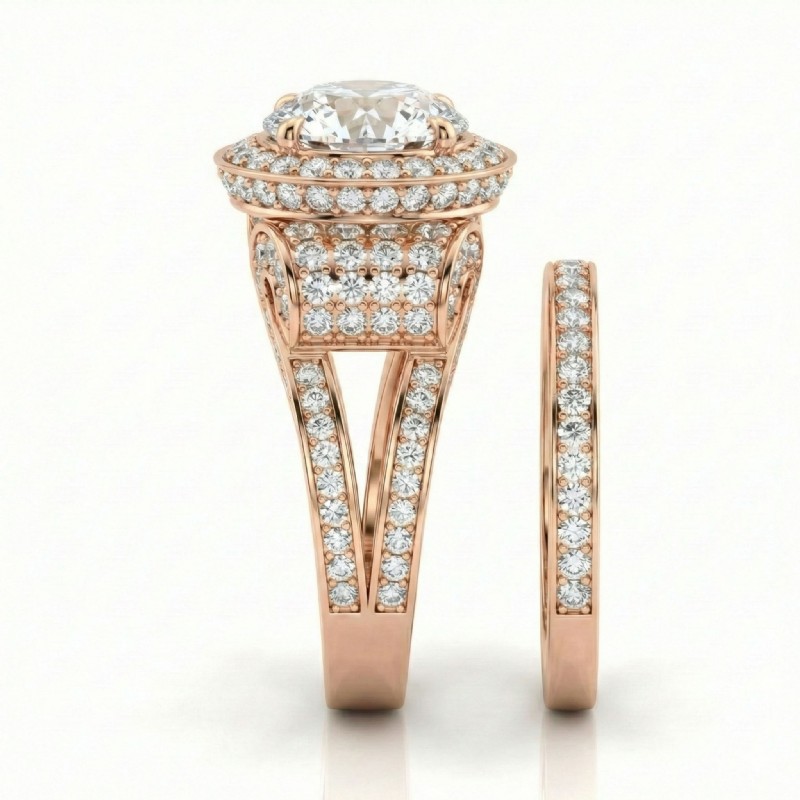 3.7Ct Diamond Engagement Ring Round Halo Pave Setting Bridal Set 14k Rose Gold.