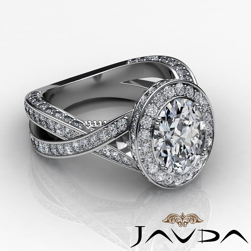 Halo Pave Set Cross Shank style Engagement Ring, center is Oval shape Diamond Report by GIA, D Color & VVS1 clarity, Made in 14k White Gold (2.3 ct. tw.)