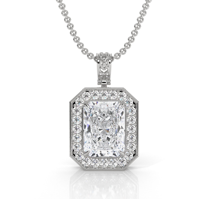 Pave Set Diamond Halo Radiant Cut Solitaire Pendant in 14k White Gold 0.61Ct.