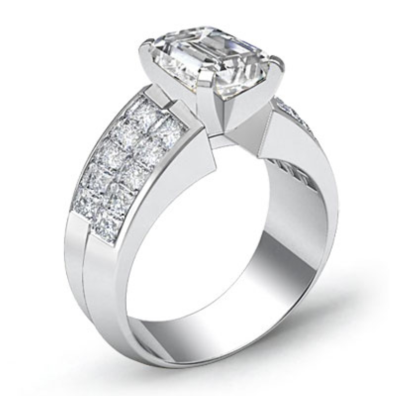 Classic Side Stone Invisible style Engagement Ring, center is Emerald shape Diamond Report by GIA, D Color & VVS1 clarity, Made in 14k White Gold (2.52 ct. tw.)