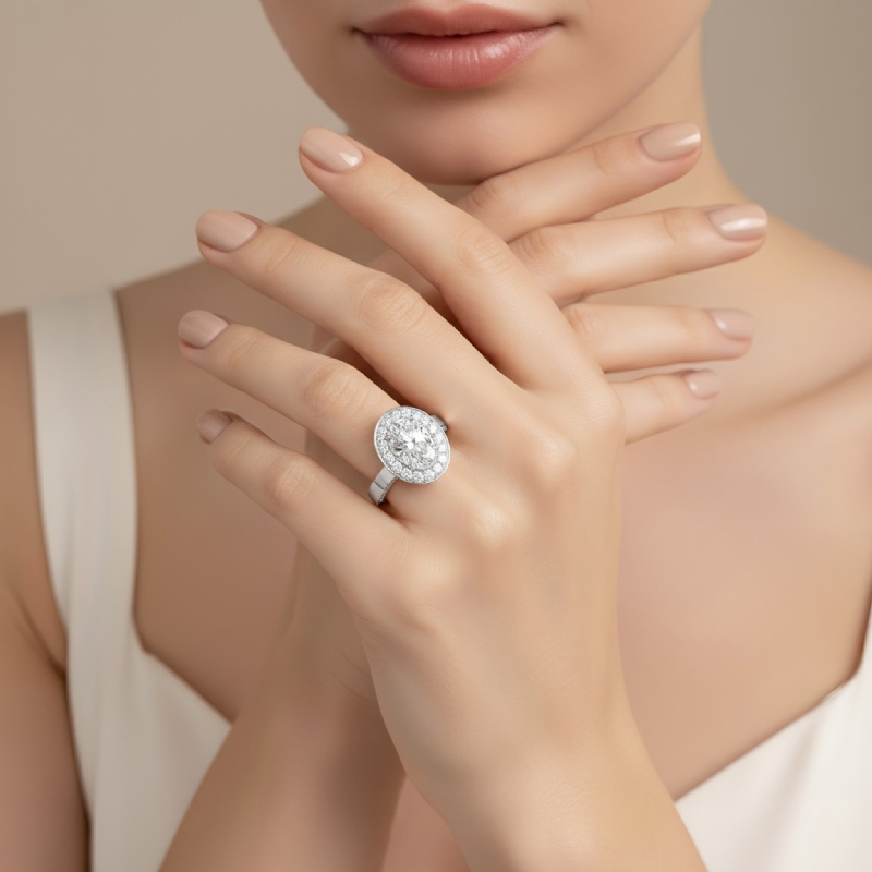 Oval shape is diamond certified by GIA, 100% natural J color & SI2 clarity {0.90 ctw.}.