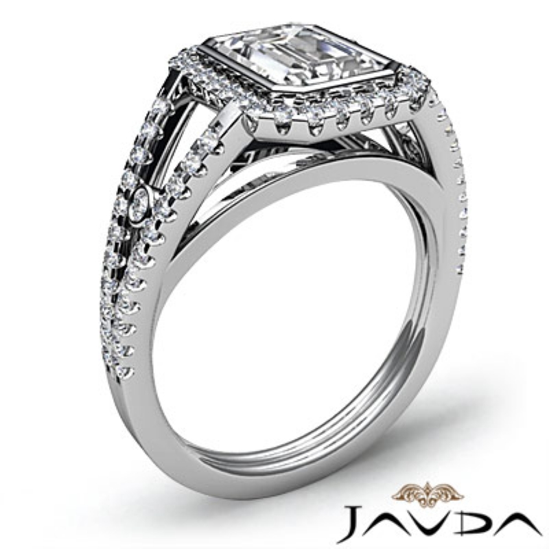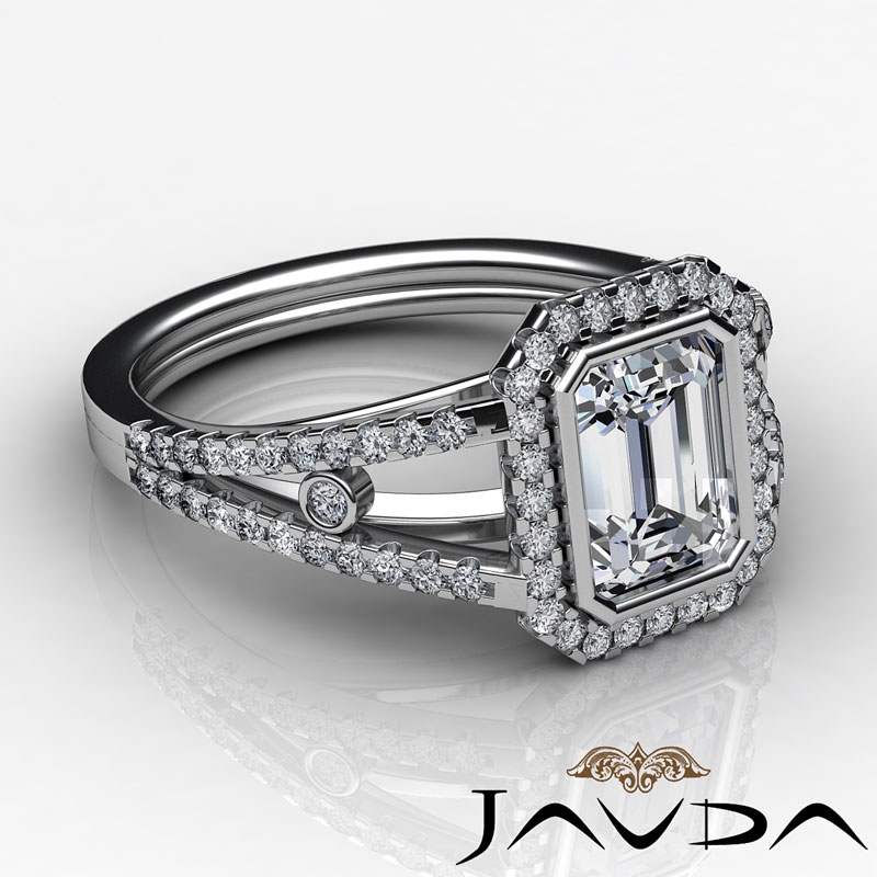 Bezel Halo Prong Setting style Engagement Ring, center is Emerald shape Diamond Report by GIA, E Color & VVS2 clarity, Made in 14k White Gold (1.33 ct. tw.)