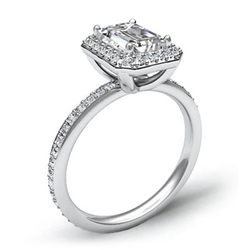 Micro Pave Set Halo Eternity style Engagement Ring, center is Emerald shape Diamond Report by GIA, D Color & VVS1 clarity, Made in 14k White Gold (1.5 ct. tw.)