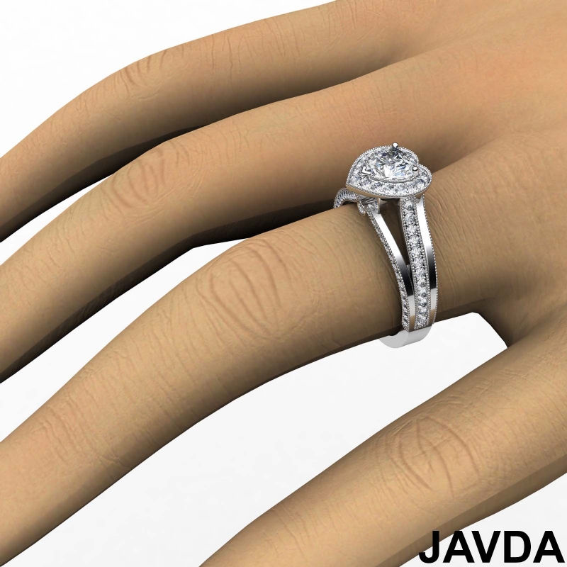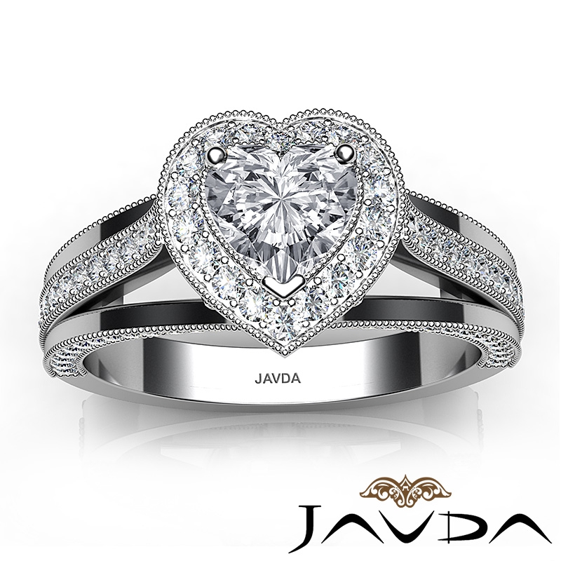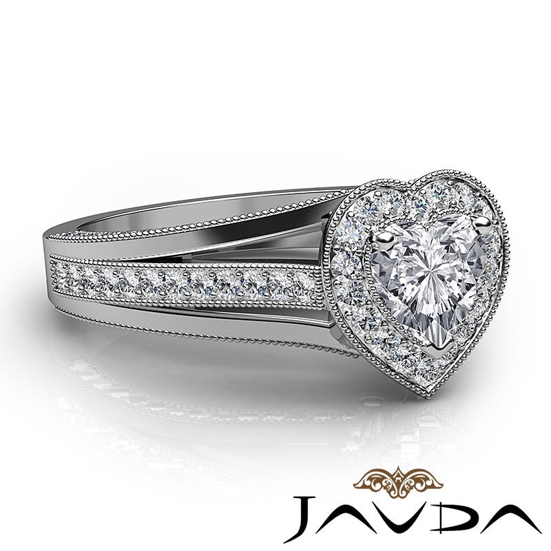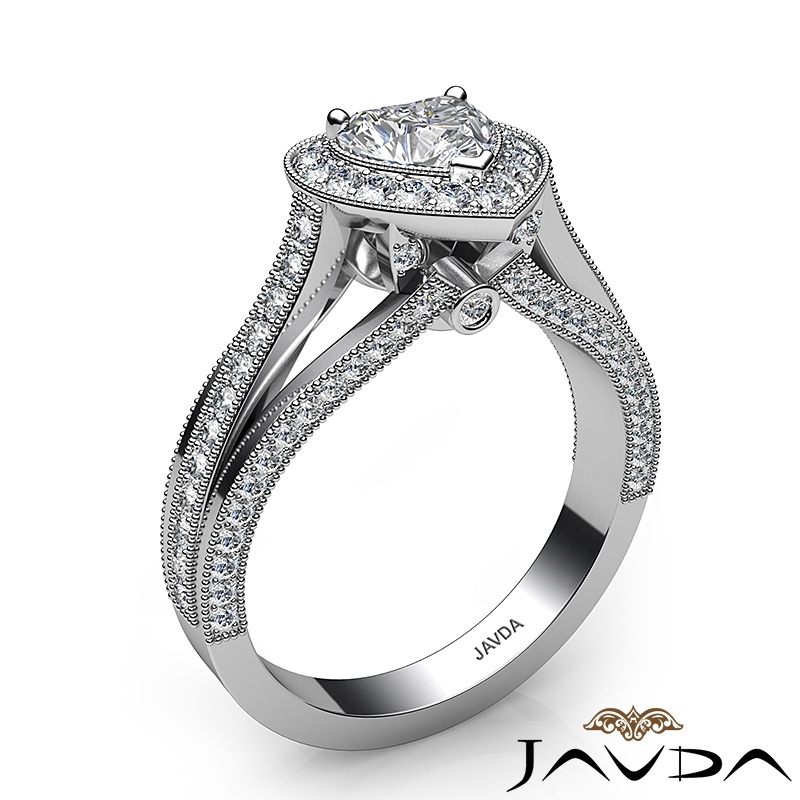 Halo Pave Diamond Engagement Heart Semi Mount Millgrain Ring 14k White Gold 0.9Ct.