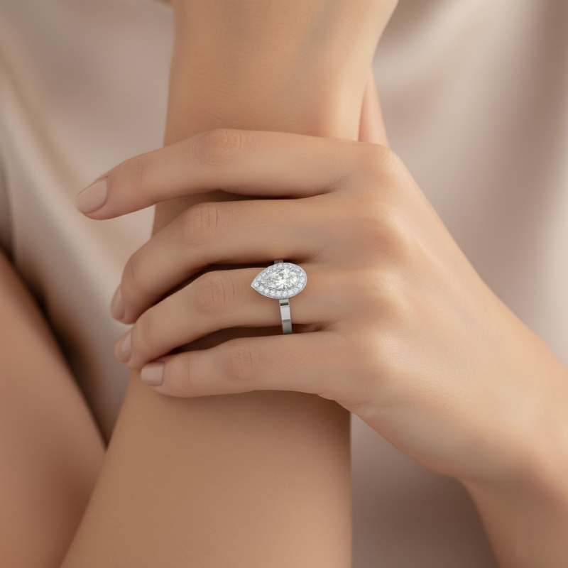 Pear shape is diamond certified by GIA, 100% natural I color & SI2 clarity {0.91 ctw.}.
