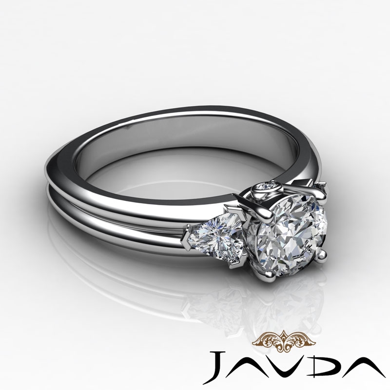 Three Stone Trillion Bezel style Engagement Ring, center is Round shape Diamond Report by GIA, E Color & VS1 clarity, Made in 14k White Gold (1.1 ct. tw.)