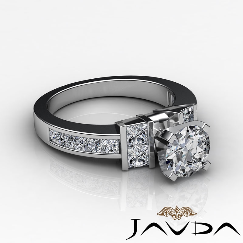 Channel Set Shank Prong style Engagement Ring, center is Round shape Diamond Report by GIA, F Color & VS1 clarity, Made in 14k White Gold (1.5 ct. tw.)