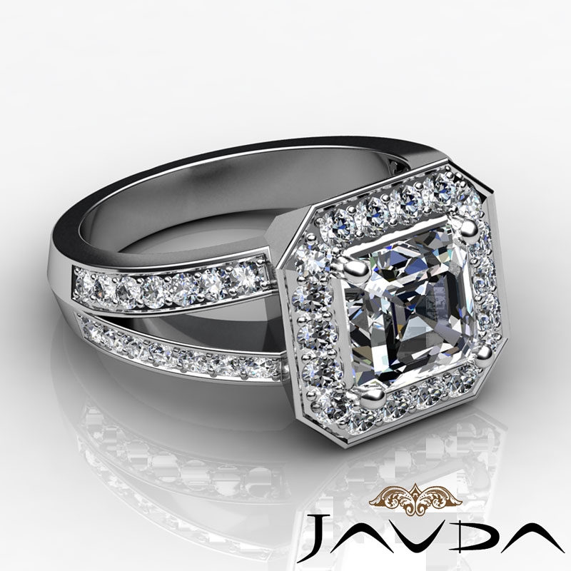 Split Shank Halo Sidestone style Engagement Ring, center is Asscher shape Diamond Report by IGI, D Color & VS1 clarity, Made in 14k White Gold (3.13 ct. tw.)