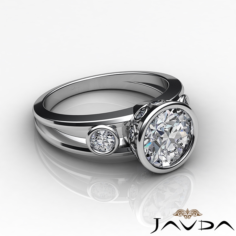 Bezel Setting Three Stone style Engagement Ring, center is Round shape Diamond Report by IGI, H Color & VVS2 clarity, Made in 14k White Gold (2.13 ct. tw.)