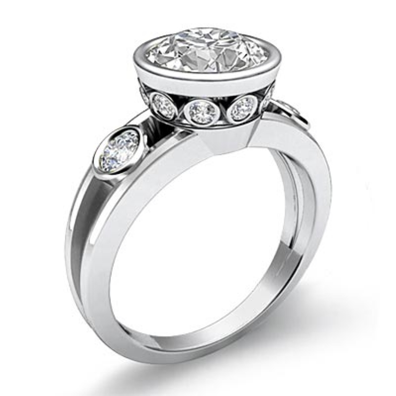 Round Bezel Diamond Engagement 3 Stone Ring Semi Mount 14k White Gold Setting 0.5Ct.