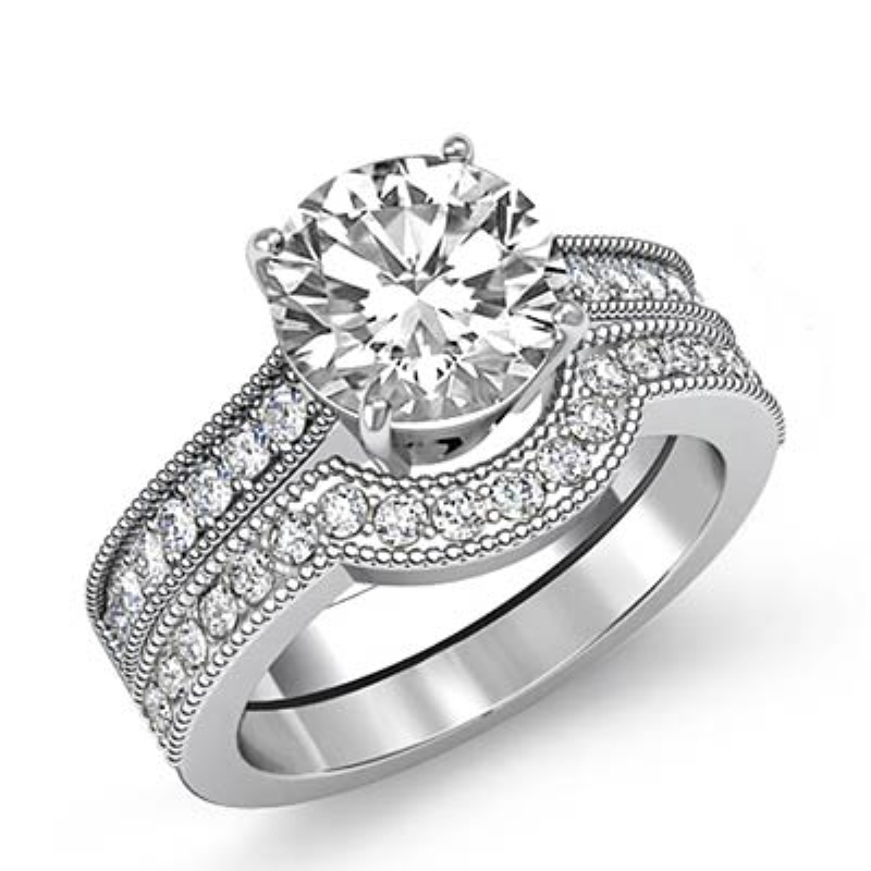 Vintage Milgrain Wedding Set style Engagement Ring, center is Round shape Diamond Report by IGI, F Color & VS2 clarity, Made in 14k White Gold (2.34 ct. tw.)