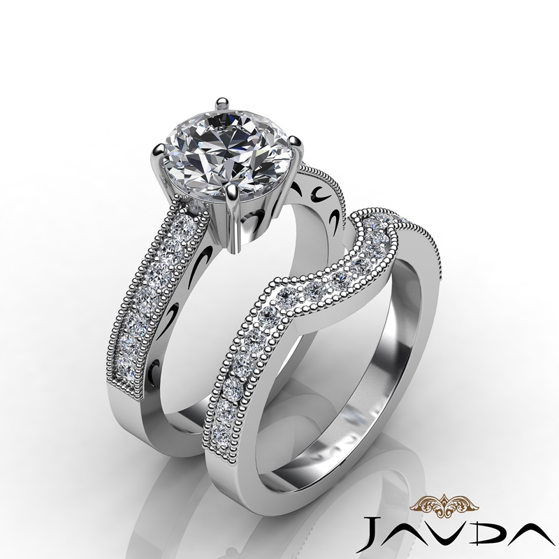 Diamond Engagement Millgrain Setting Ring Round Bridal Set 14k White Gold 0.6Ct - javda.com
