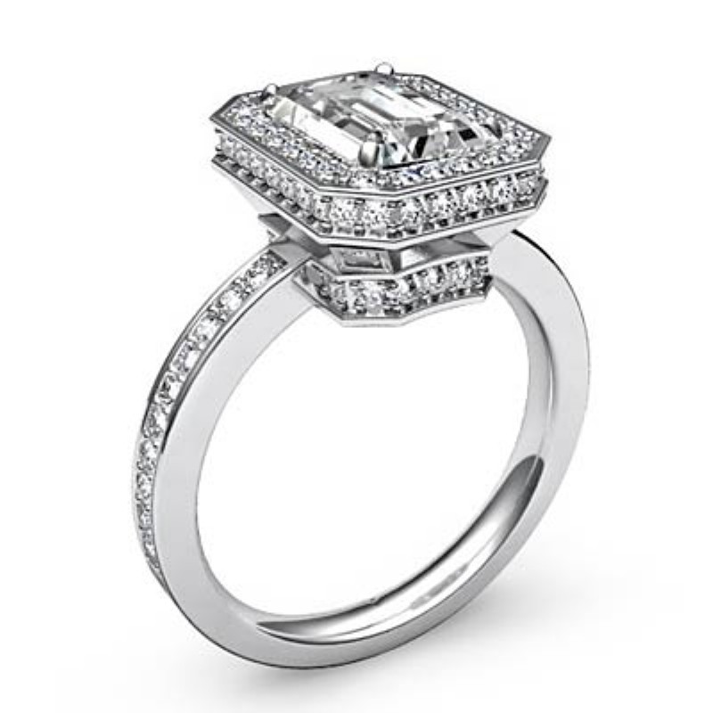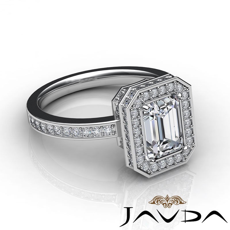 0.89Ct Halo Pave Setting Diamond Engagement Ring Emerald Semi Mount 14k White Gold.