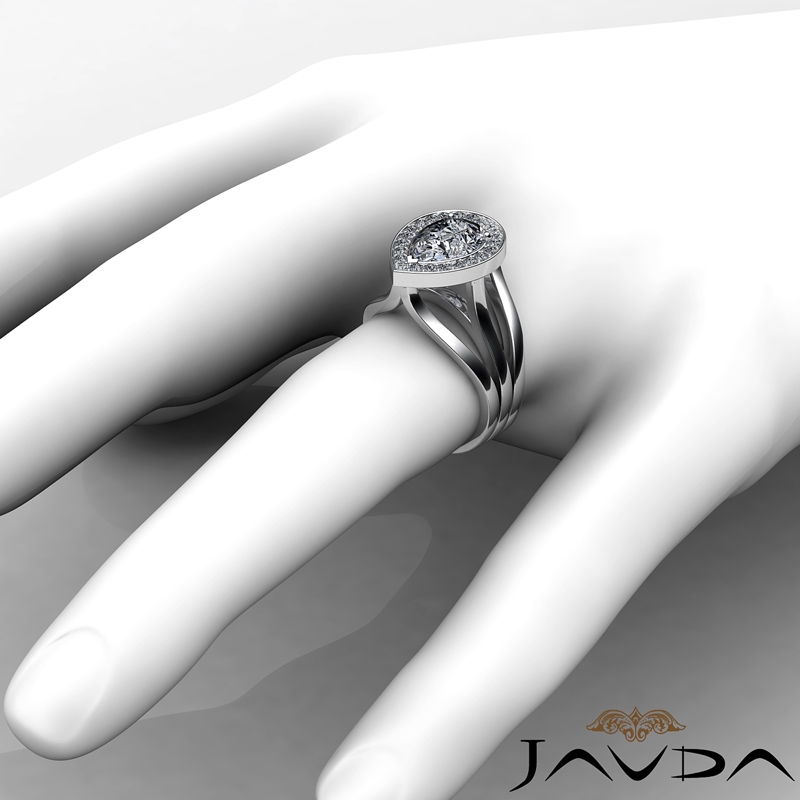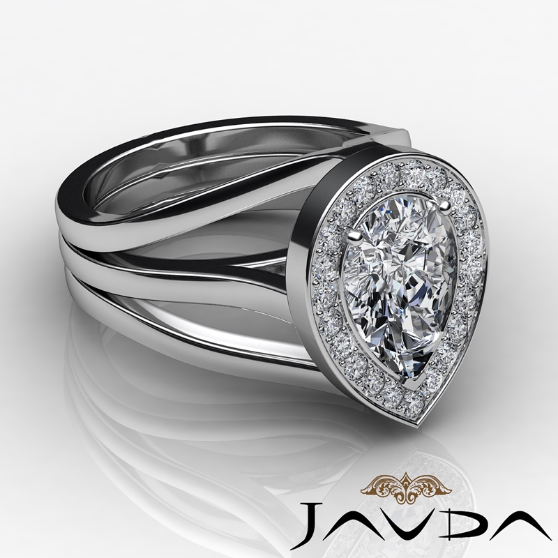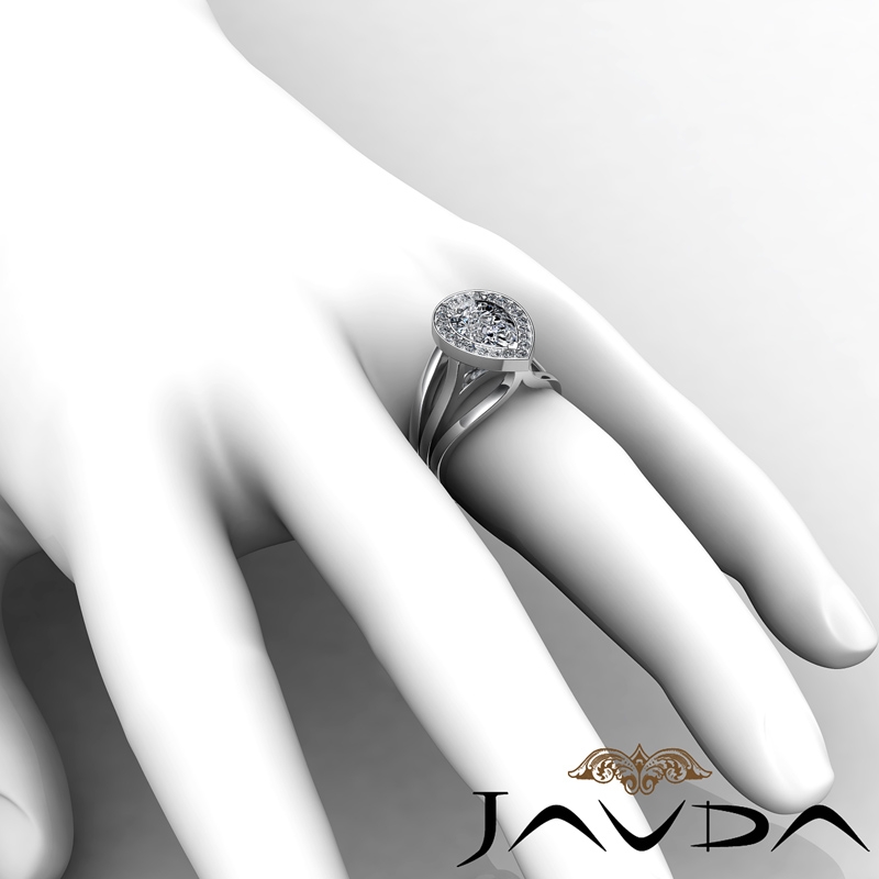 Split Shank Bridge Halo Pave style Engagement Ring, center is Pear shape Diamond Report by IGI, E Color & VS1 clarity, Made in 14k White Gold (1.62 ct. tw.)