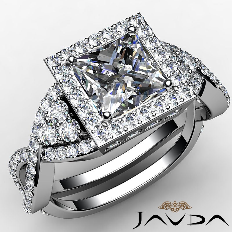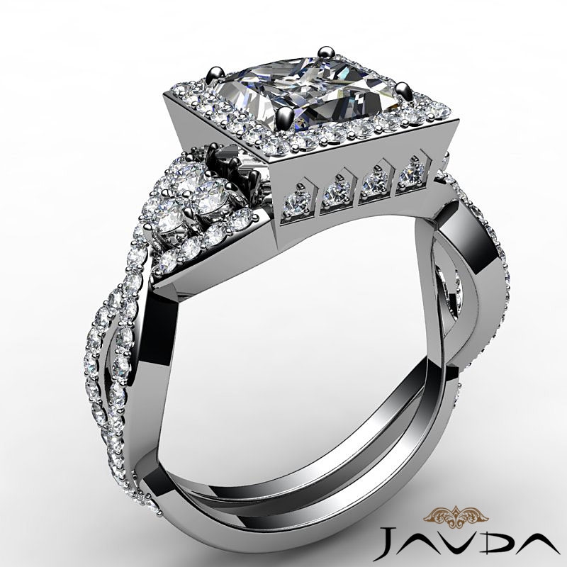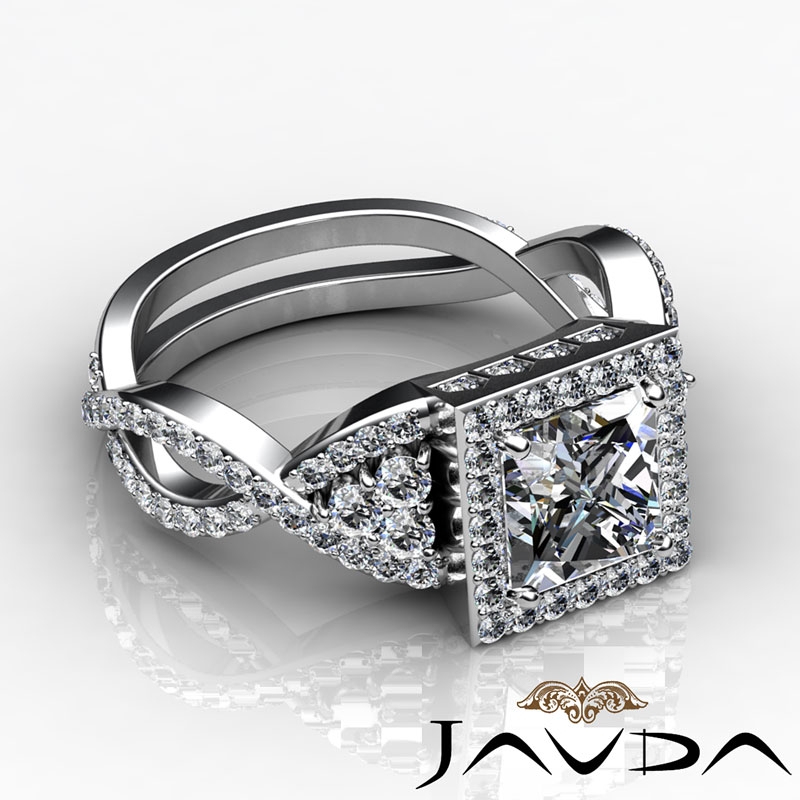 Twisted Shank Halo Micro Pave style Engagement Ring, center is Princess shape Diamond Report by GIA, J Color & VS1 clarity, Made in 14k White Gold (2.58 ct. tw.)