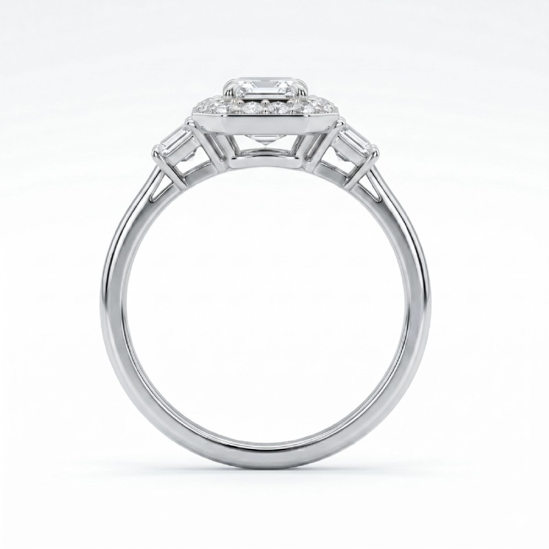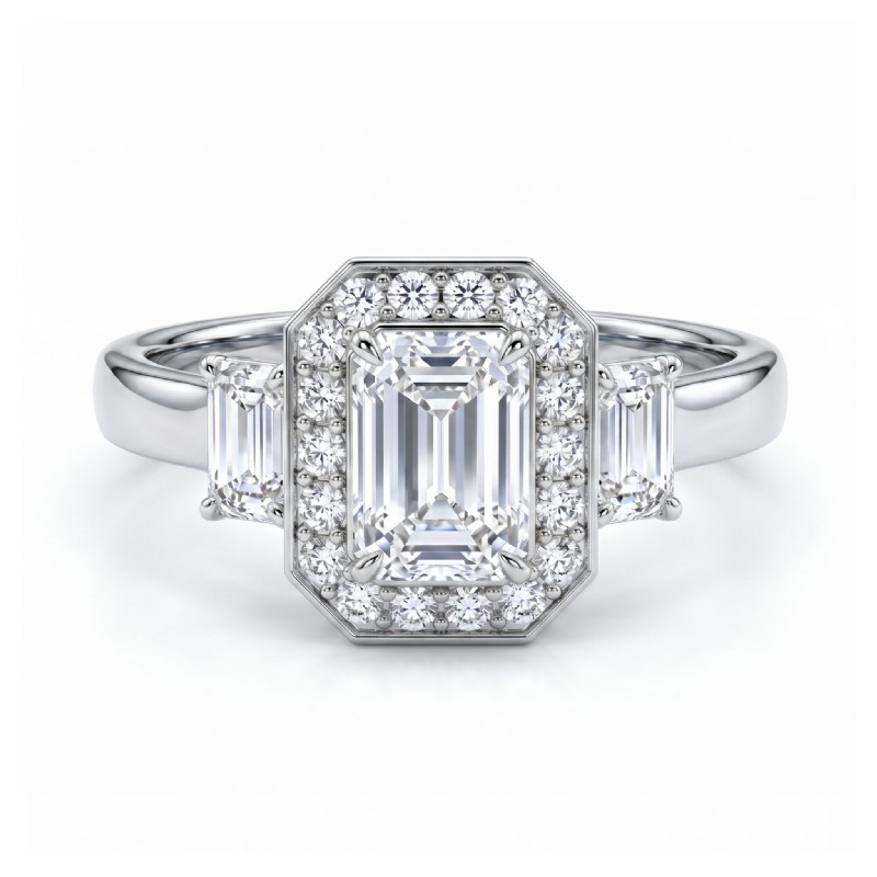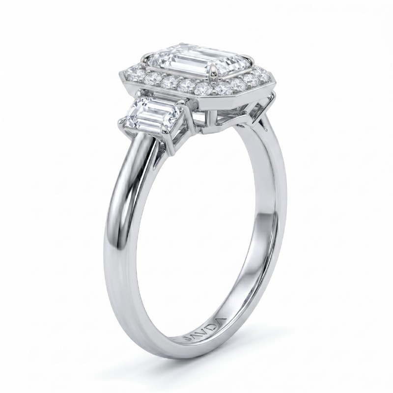 3 Stone Halo Diamond Engagement Emerald Semi Mount 14k White Gold Ring 0.78Ct.