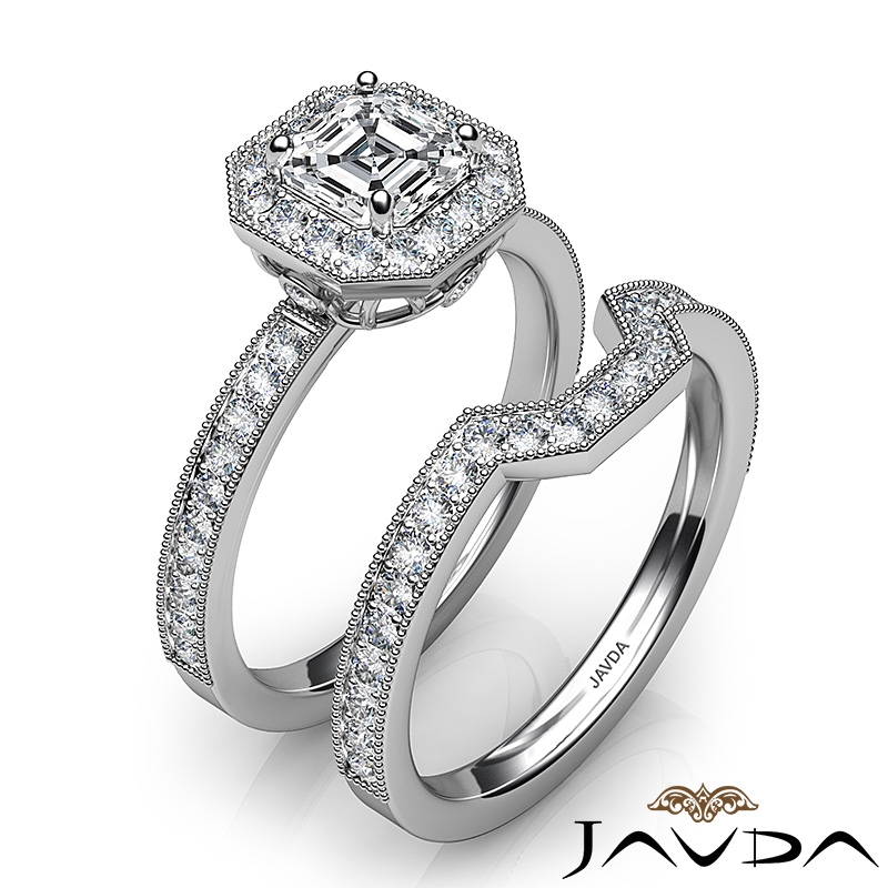 Pave Diamond Engagement Ring Asscher Bridal Set 14k White Gold Semi Mount 1Ct.