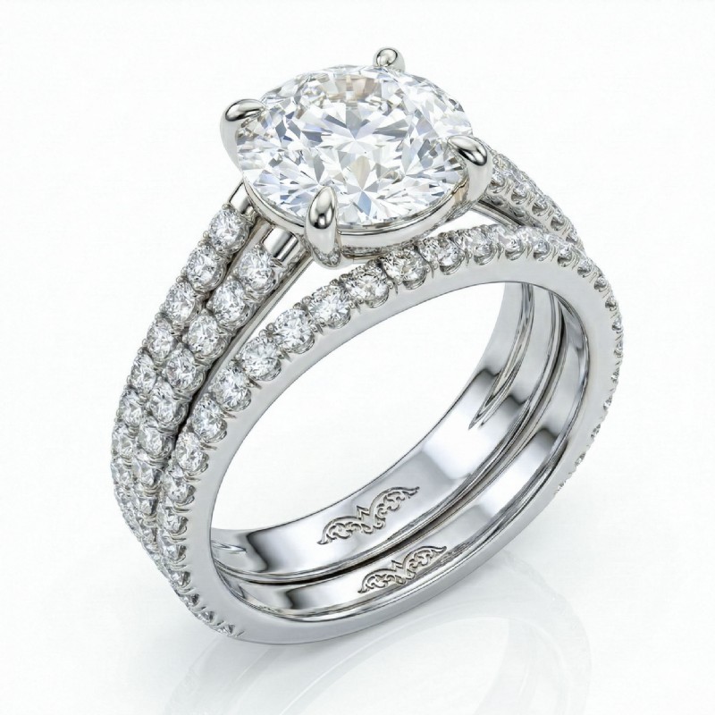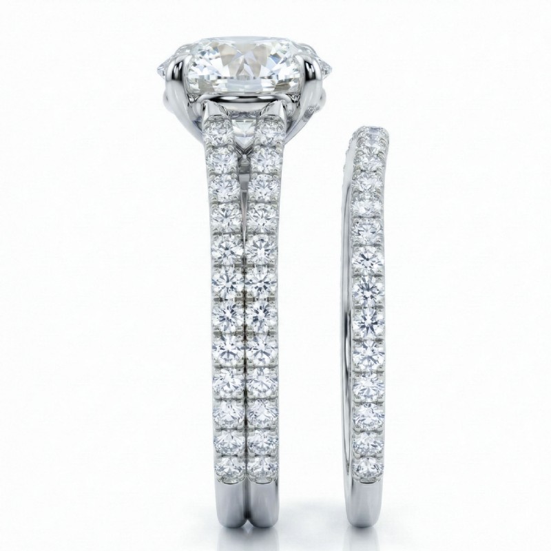 French Pave Split Shank Round Semi Mount Diamond Bridal Set Ring 14k White Gold 1.1Ct.