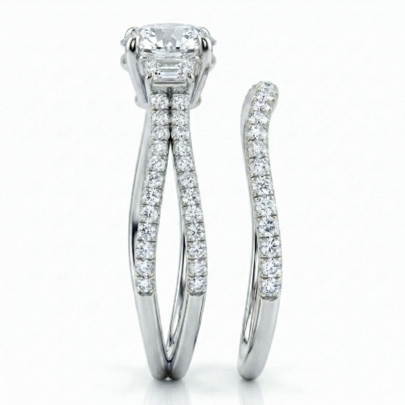 0.95Ct Three Stone Round Semi Mount Bridal Set Diamond Engagement Ring 14k White Gold.