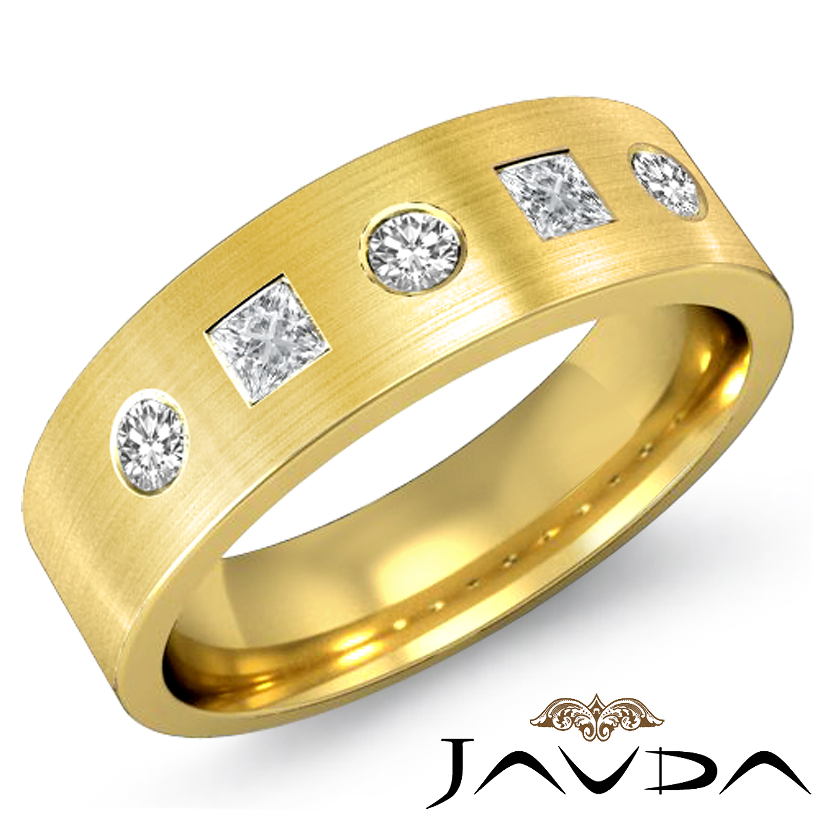 The dazzling matte finished round & princess diamond men's half wedding band is made from 18k Gold Yellow. Featuring matte finished with princess and