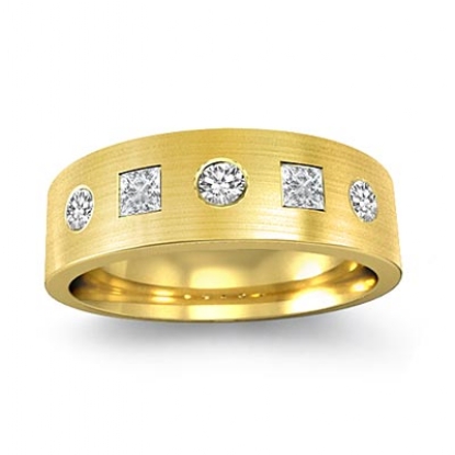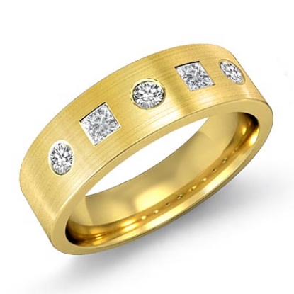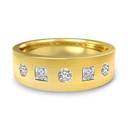 The dazzling matte finished round & princess diamond men's half wedding band is made from 18k Gold Yellow. Featuring matte finished with princess and round diamonds in a bezel setting.