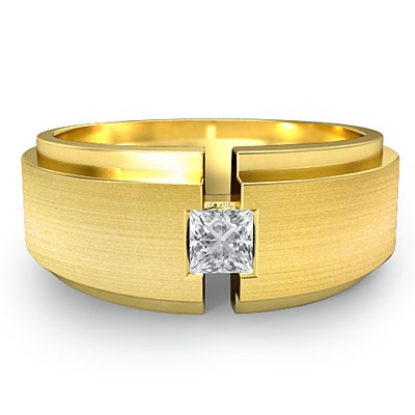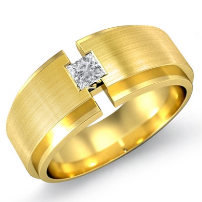 Classic matte finished solitaire princess diamond men's half wedding band is made from 18k Gold Yellow. This ring features polished edge with matte finish center and one princess diamond set in a bezel setting.
