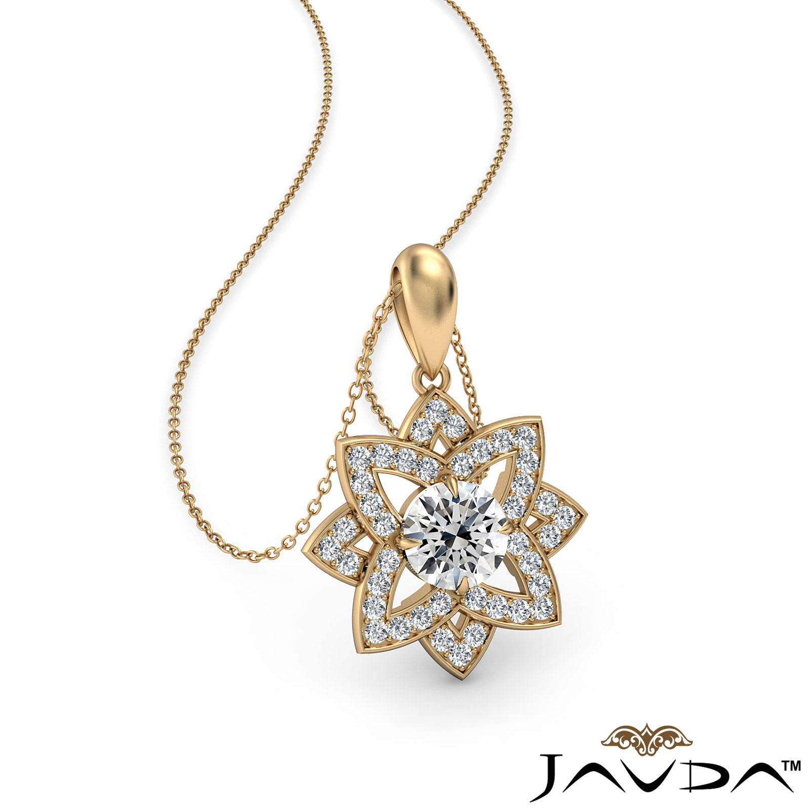 An exquisite snowflake diamond pendant necklace crafted in 18k Gold Yellow. This delicate piece of jewelry features diamonds in a micro pave setting with 18 inch rolo chain that secures with a spring ring clasp.