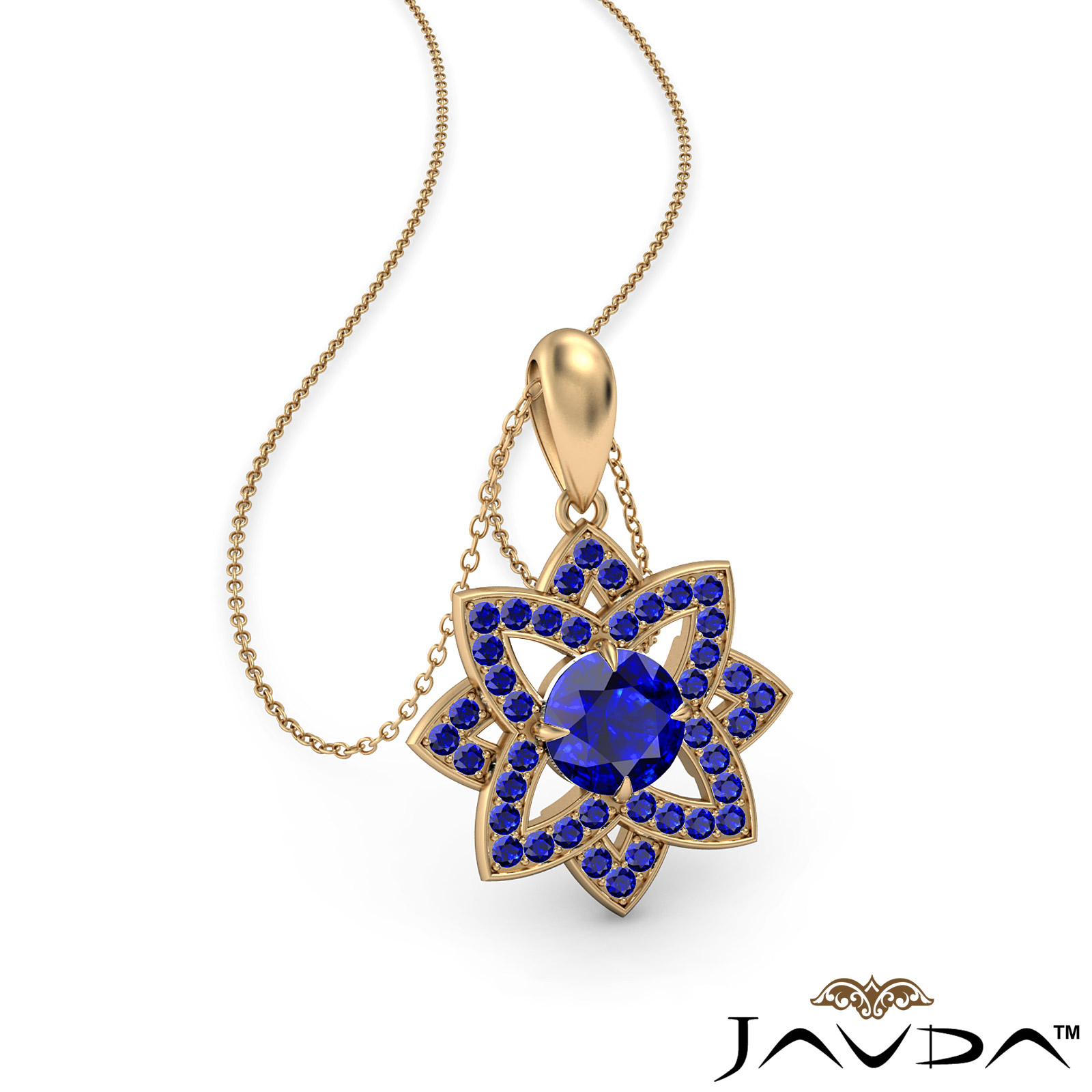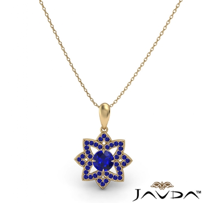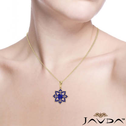An exquisite snowflake sapphire pendant necklace crafted in 18k Gold Yellow. This delicate piece of jewelry features sapphire gemstone in a micro pave setting with 18 inch rolo chain that secures with a spring ring clasp.