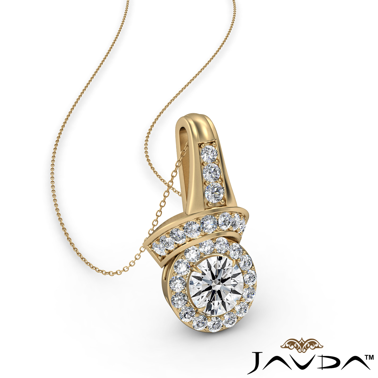 Sparkling designer halo diamond pendant necklace made in 18k Gold Yellow. The elegant pendant features round diamond in a micro pave setting, this pendant comes with 18 inch rolo chain that secures with a spring ring clasp.