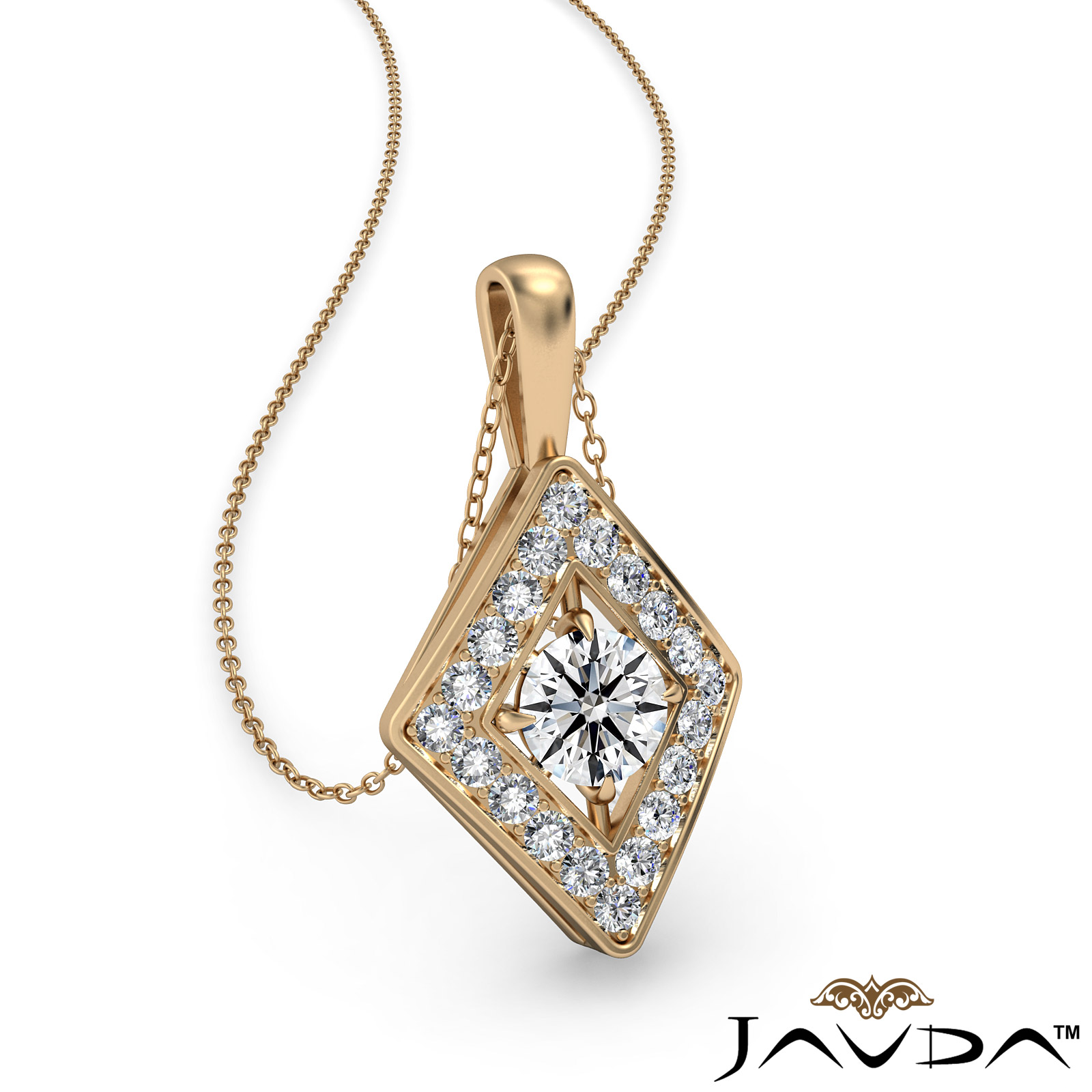 Stylish and elegant kite style diamond pendant necklace crafted in 18k Gold Yellow. This fashion pendant features round diamond in a micro pave setting encircle to a center diamond completing this striking look with polished bail hang on 18 inch rolo chain.