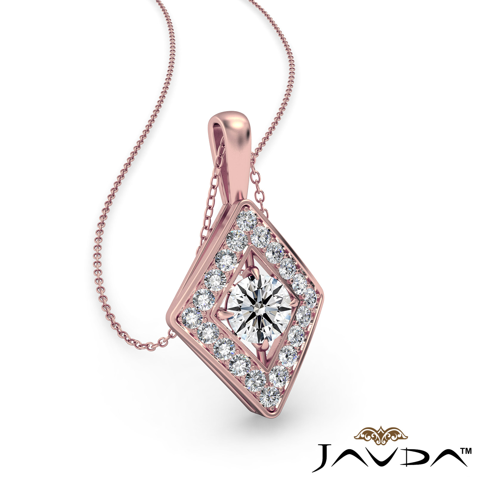 Stylish and elegant kite style diamond pendant necklace crafted in 18k Rose Gold. This fashion pendant features round diamond in a micro pave setting encircle to a center diamond completing this striking look with polished bail hang on 18 inch rolo chain.