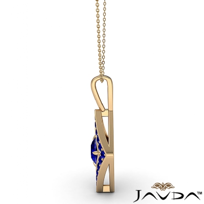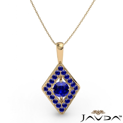 Stylish and elegant kite style sapphire pendant necklace crafted in 14k Gold Yellow. This fashion pendant features round sapphire gemstone in a micro pave setting encircle to a center gemstone completing this striking look with polished bail hang on 18 inch rolo chain.