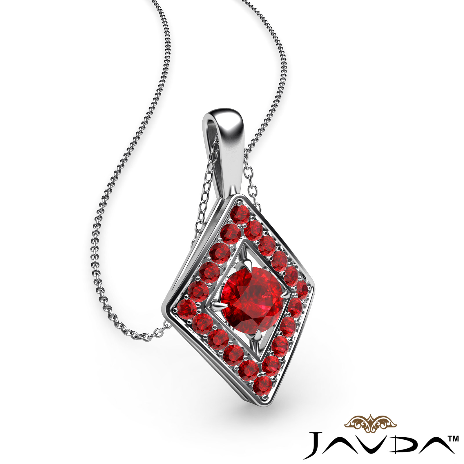 Stylish and elegant kite style ruby pendant necklace crafted in 18k Gold White. This fashion pendant features round ruby gemstone in a micro pave setting encircle to a center gemstone completing this striking look with polished bail hang on 18 inch rolo chain.