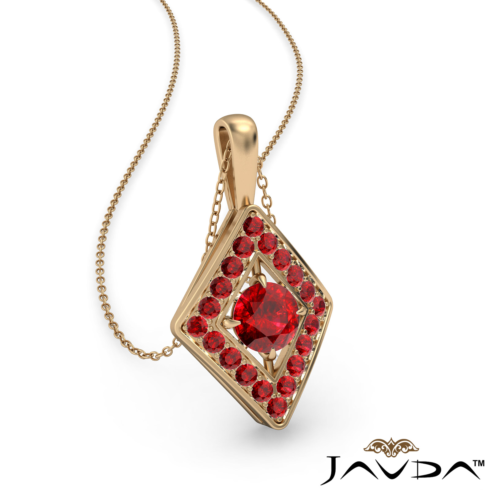 Stylish and elegant kite style ruby pendant necklace crafted in 18k Gold Yellow. This fashion pendant features round ruby gemstone in a micro pave setting encircle to a center gemstone completing this striking look with polished bail hang on 18 inch rolo chain.