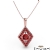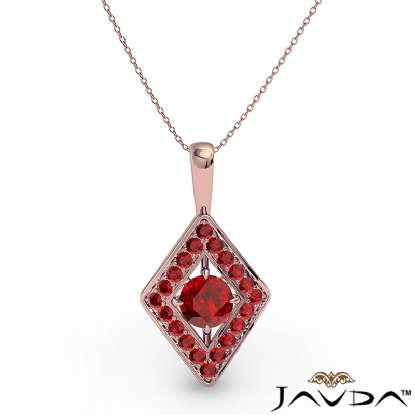 Stylish and elegant kite style ruby pendant necklace crafted in 18k Rose Gold. This fashion pendant features round ruby gemstone in a micro pave setting encircle to a center gemstone completing this striking look with polished bail hang on 18 inch rolo chain.