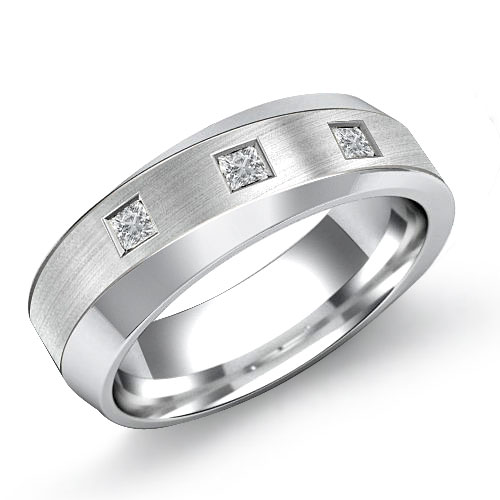 This sophisticated diagonal matte finish diamond men's half wedding band is crafted in Platinum 950. Featuring polished beveled sides and matte finished center with 3 stone princess cut diamonds set in a bezel setting.