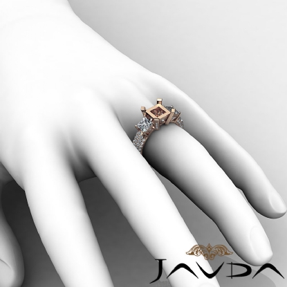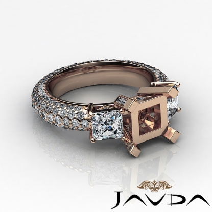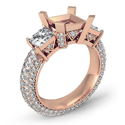 Beautiful in its own way! A glamorous semi mount princess center diamond sparkles, clustered by two princess cut side diamonds all in prong setting. Pave set diamonds enhance this 14k Rose Gold engagement ring. (2.8Ct. tw.)