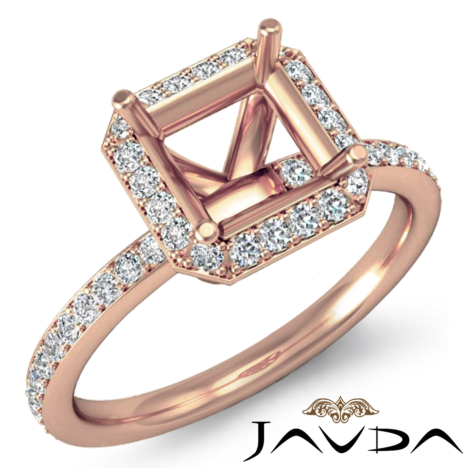 An elegant statement, this asscher diamond semi mount engagement ring captures all the romance, with pave set round diamonds in halo & on the shank. This ring is made in glorious 18k Rose Gold (1Ct. tw.)