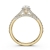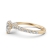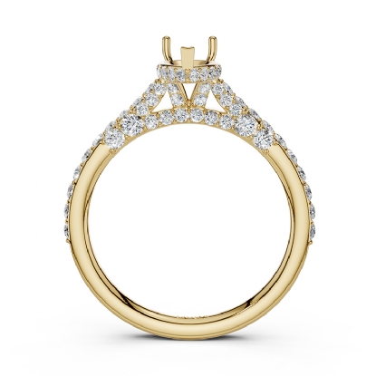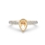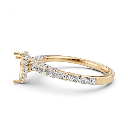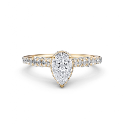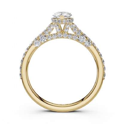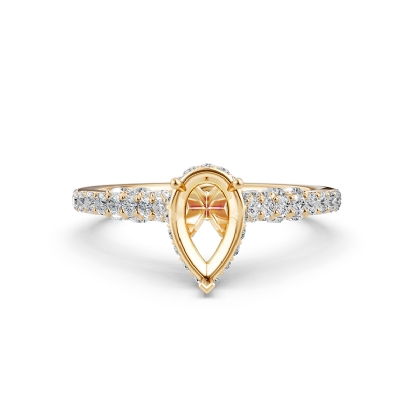 Simple cathedral pear semi mount bridge accent diamond engagement ring made in 14k Gold Yellow. This petite diamond ring features diamonds in a micro pave setting on circa halo with bridge accent and graduated diamond on shank.