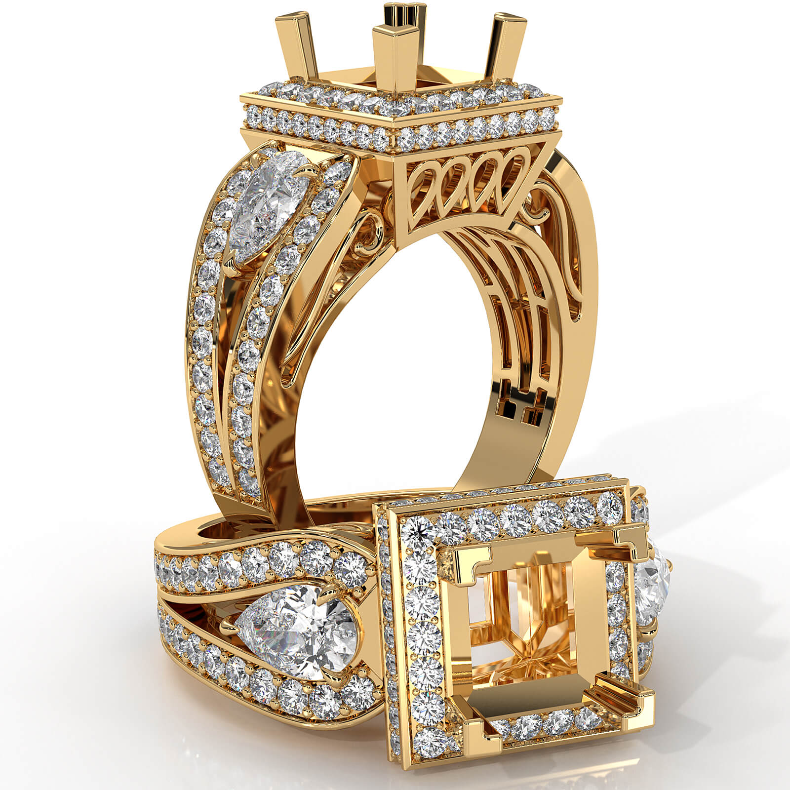 Vintage inspired 3 stone princess semi mount circa halo diamond engagement ring crafted in 18k Gold Yellow. This romantic diamond ring features fine filigree design with diamonds in a micro pave setting and