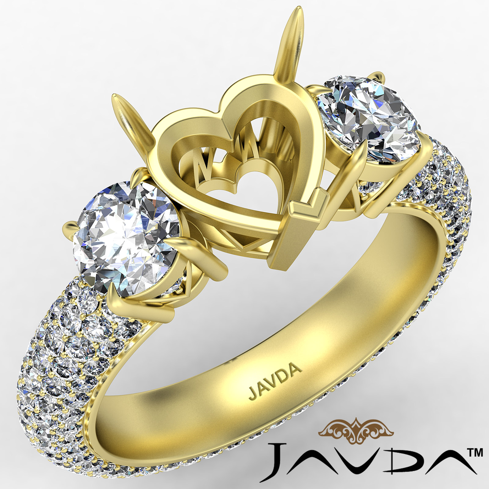 A stunning 3 stone diamond eternity heart semi mount engagement ring made in 18k Gold Yellow. This beautiful diamond ring features diamonds on eternity shank in a micro pave setting and